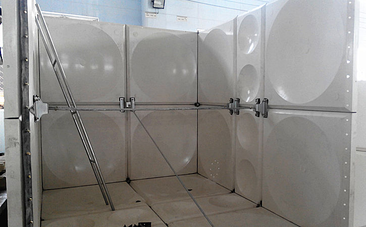 如果僅僅用水箱板和膠條組成我們需要尺寸的水箱,雖然不透水了,但是還不能盛水,因?yàn)槭⑺笏鋾?huì)承受一個(gè)向外的張力,必須加上拉筋系統(tǒng)受力,否則玻璃鋼水箱會(huì)形成一個(gè)高力矩體系,很容易撐壞。