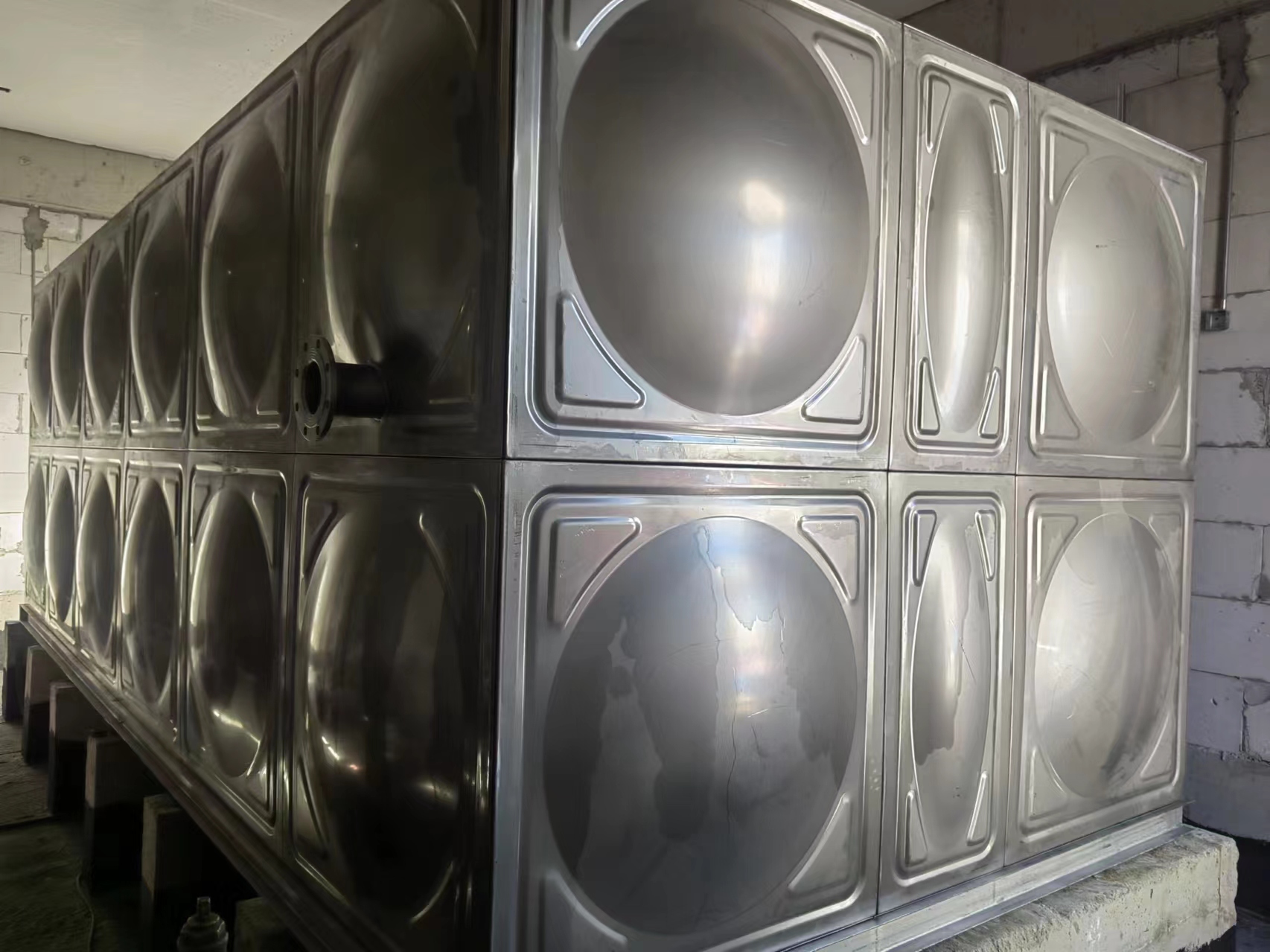 不銹鋼消防水箱由單元矩型模壓板,優化組合,任意拼裝,利用少的耗材,通過材料變型的方法達到佳強度的效果,水箱成型后的線型流暢,立體感好,且能美化市容。