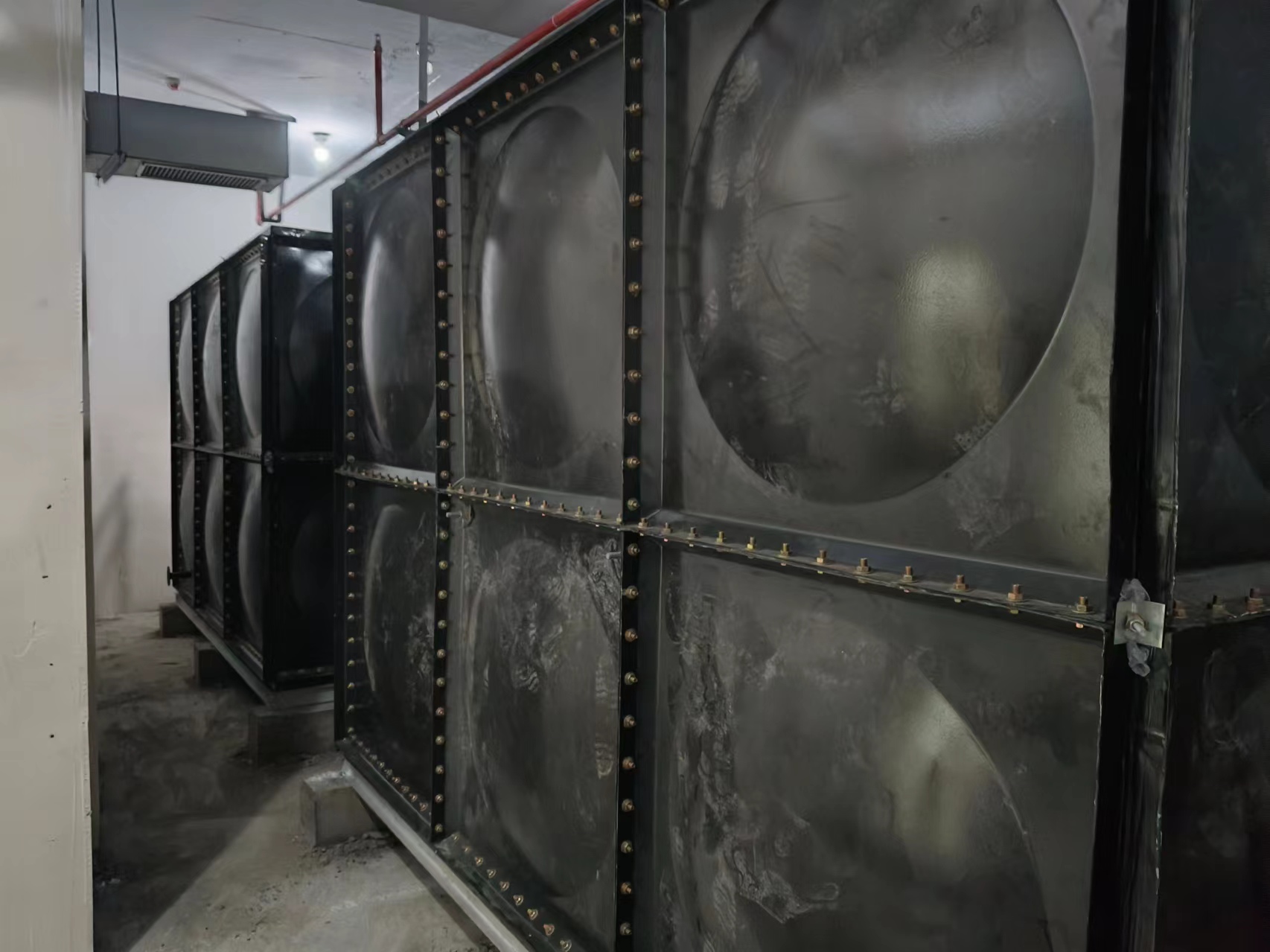 8、上梯子,內梯放在里面就可以;上外梯時,外梯下面的兩個小側放在下面槽鋼上,然后用四個梯子夾鉤住,上、下面各兩個,在水箱板的法蘭上打上眼,穿上螺絲擰緊即可。整臺水箱就安裝完畢了。